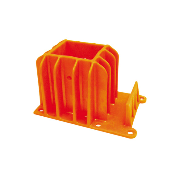 Angel Guardrail Base with integrated toe board slot - high strength orange plastic - 8-1/2 (L) x 5-3/4 (W) x 5-1/4 (H)