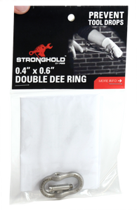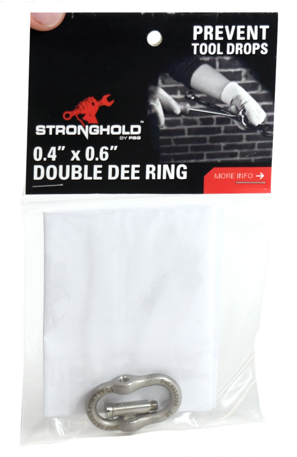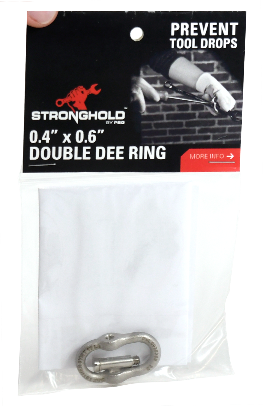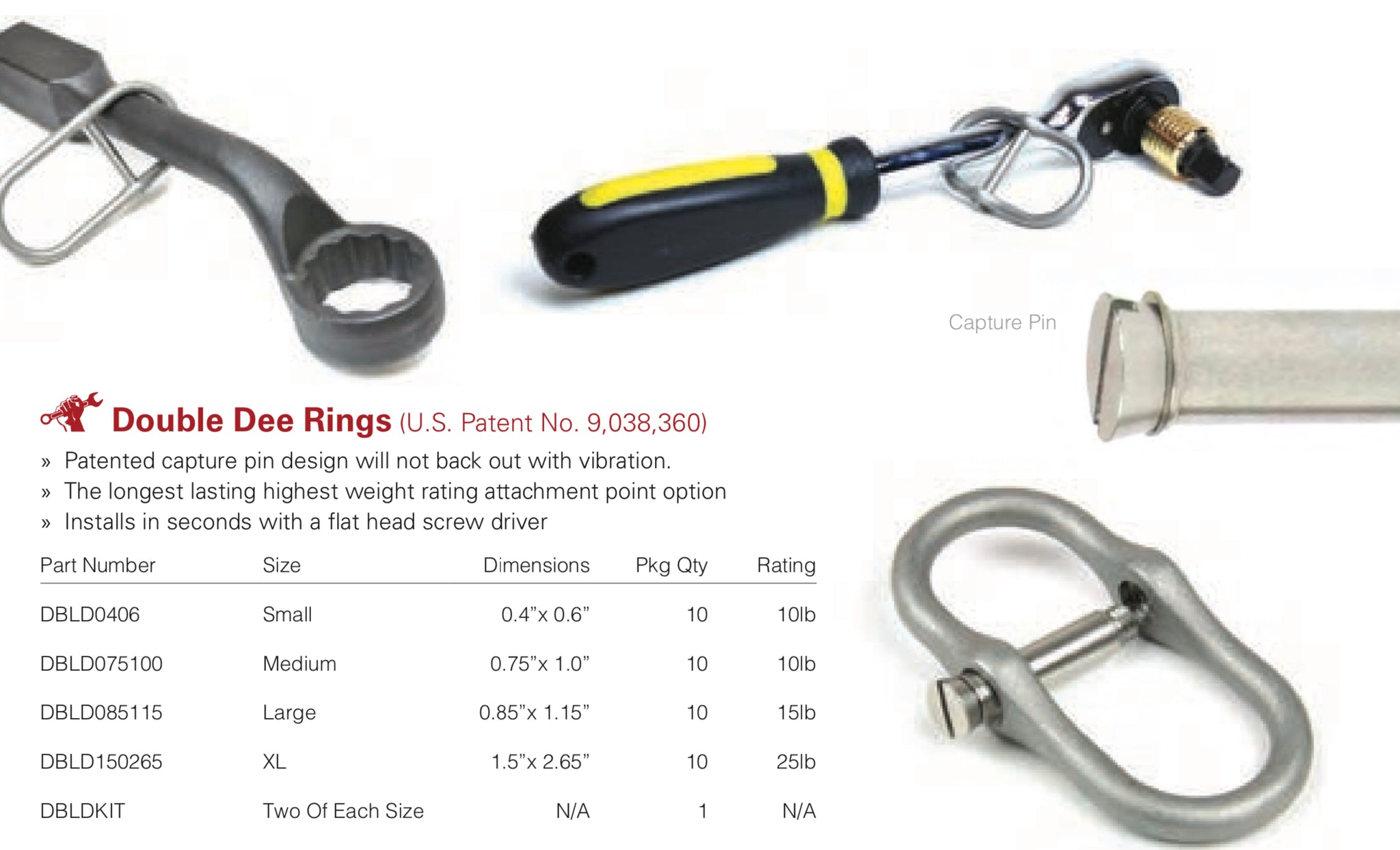 DOUBLE D-RING, SMALL (Single) - The patented Double D-Ring is an easily installed attachment point for open- and closed-end wrenches or other compatible tools. Its stainless-steel construction and anti-backout captive pin provide both long-term durability and security, giving the worker at height confidence on todayβs demanding jobsites. The Double-Ring is compatible with a variety of fixed-length, bungee, or retracting tool tethers, making it an essential part of a comprehensive dropped tools prevention program.