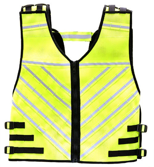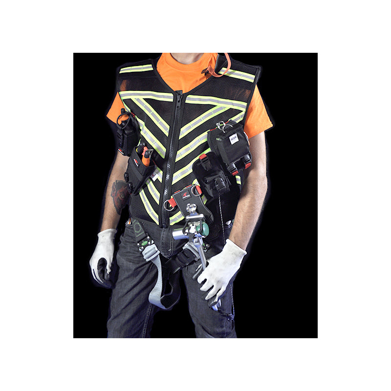 LIME GREEN MOLLE RETRACTABLE TOOL VEST M-XL (Single) - Breathable mesh and reflective accents for easy visibility. Multiple points of adjustment in girth and height. Completely customizable with easy on and off front zipper. Horizontal webbing for backside pouches. Opening for harness D-Ring Comes in Black (shown) or Fluorescent Green NOTE: Tools not included. Combined weight of rated pouches should not exceed 15lbs (6.8kg) Patents Pending MOLLE Retractable Tool Vest